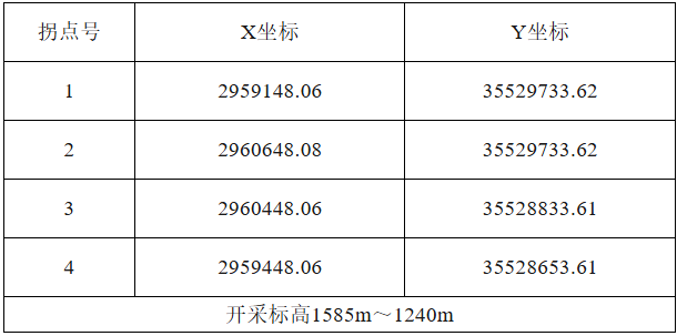 (六)礦區(qū)面積及坐標(biāo):面積1.242平方公里,礦區(qū)坐標(biāo)如下: