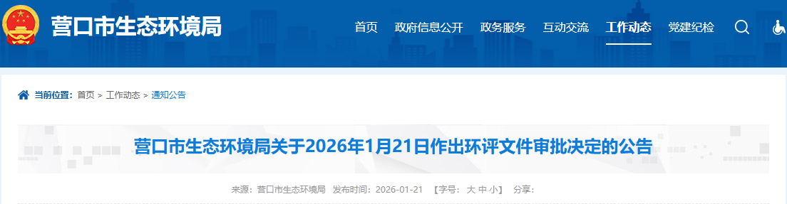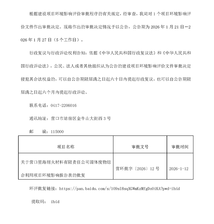 營(yíng)口市生態(tài)環(huán)境局關(guān)于營(yíng)口星海耐火材料有限責(zé)任公司固體廢物綜合利用項(xiàng)目作出環(huán)評(píng)文件審批決定的公告